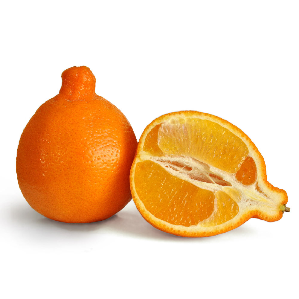 Mineola tangerines are larger in size compared to most tangerines and have a distinctive bell shape. It has an orange peel. The fruit is often characterized by a prominent neck or knob at the top, similar to a bell.